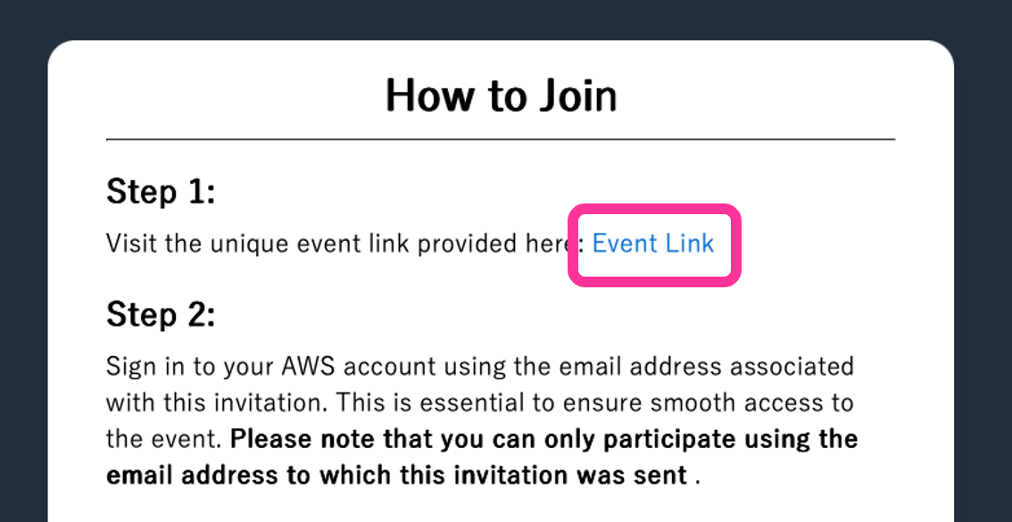 - "AWS Jam – Invitation" というタイトルのメールがないか、メールの受信箱を確認してください。イベントの詳細が含まれています。