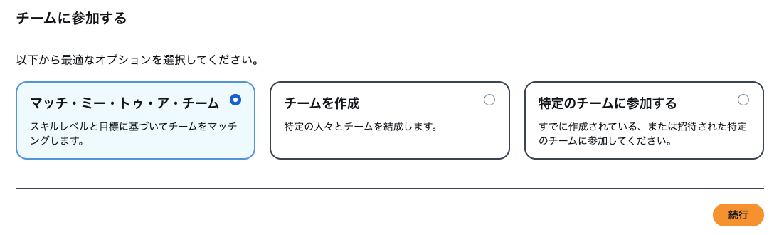 参加者同士でチームを結成したり、既存のチームを選んで参加できます。その時のオプションは以下の3つです。